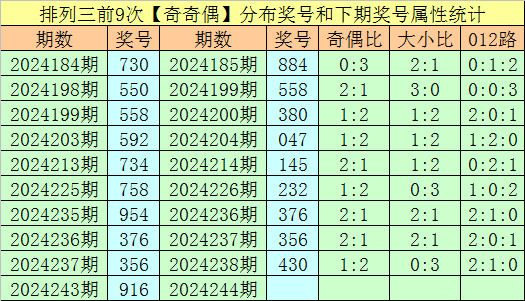 上期回顾:排列三第2024243期开出奖号916,类型为:奇奇偶、010路和大小大。