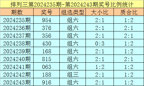 上期回顾:排列三第2024243奖号开出916,奖号质合比为1:2,大小比为2:1,跨度为8,类型为组六。
