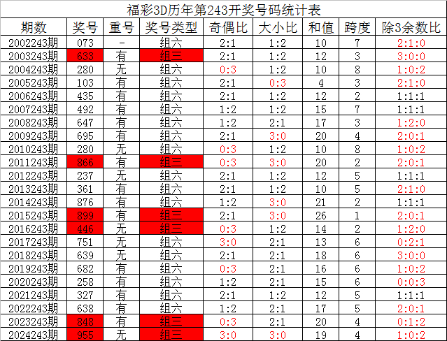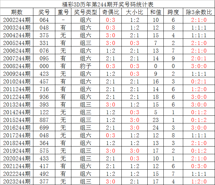 福彩3D第2024244期夏姐推荐: