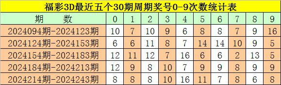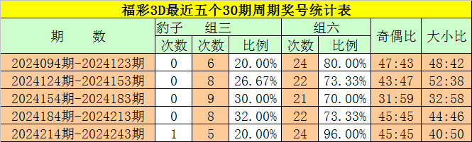 在最近一个30期周期内(第2024214期-第2024243期),组三(含豹子)号码共出现6期,占开奖总数的24%,组六奖号共出现24期,开出比例为96%,组六号码轮空1期,本期重点关注组六号码出现。