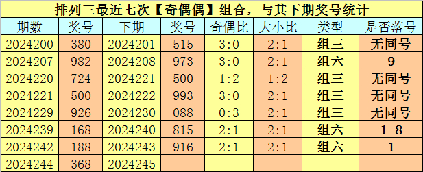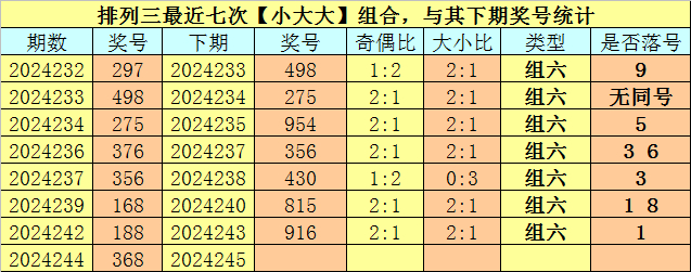 开奖回顾:排列三第2024244期开奖号码为:368。奖号类型为:组六,大小类型为:小大大,奇偶类型为:奇偶偶,包含重号:6。