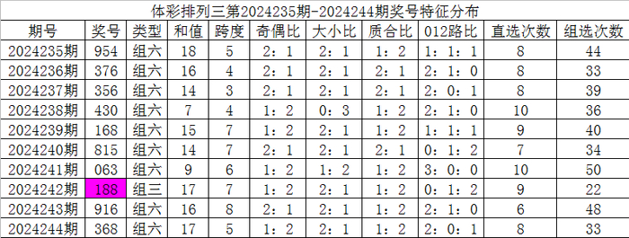 开奖公告:体彩排列三第2024244期开出奖号:368。组六,有重号:6,奇偶比1:2,大小比2:1,012比2:0:1,和值17,跨度5。