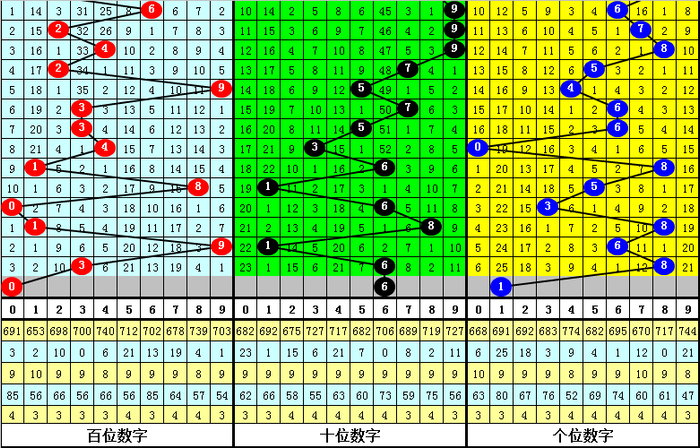 百位分析:该位最近10期出现范围在0-9之间,波动了10个点位,波动范围较大,上期开出号码3,下降了6个点位,本期看好该位号码下降。另外该位最近10期大小比为3:7,小 号走势热出,本期看好小 号继续出现,参考号码0。