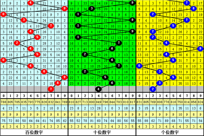 百位分析:上期百位开出奖号:8,最近9期该位奖号大小比为5:4,其中大号5出现2次,6、8、9出现1次,7出现0次,小 号4出现2次,0、2出现1次,1、3出现0次,本期百位参考大号,胆码关注7。