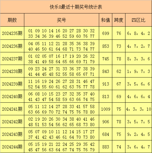 快乐8第2024244期奖号开出:05 15 19 21 22 24 25 29 35 42 45 47 56 63 64 67 74 75 76 79,其中奖号和值为883,跨度为74,四区比为3:6:4:7。