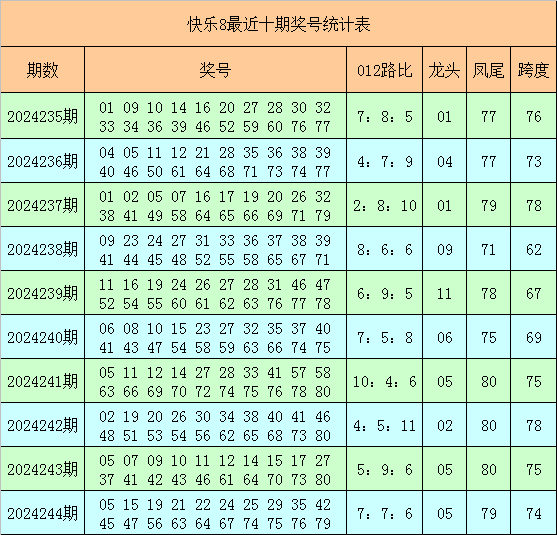 快乐8第2024244期奖号为:05 15 19 21 22 24 25 29 35 42 45 47 56 63 64 67 74 75 76 79,其中奖号012路比为7:7:6,0路号码(7个):15、21、24、42、45、63、75,1路号码(7个):19、22、25、64、67、76、79,2路号码(6个):05、29、35、47、56、74。