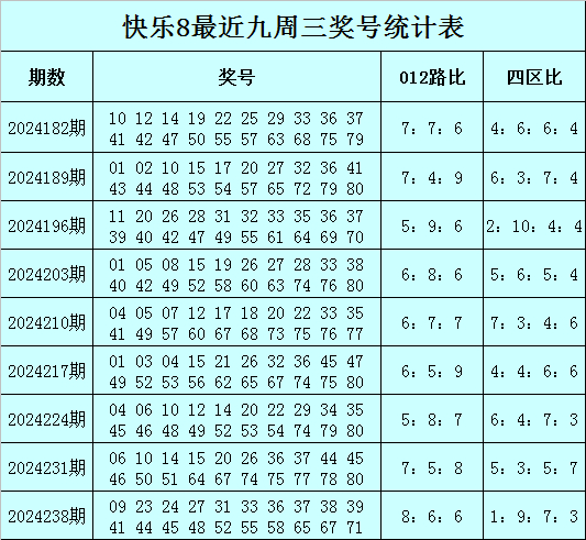 福彩快乐8第2024238期(上周三)开奖回顾:09 23 24 27 31 33 36 37 38 39 41 44 45 48 52 55 58 65 67 71,其中奖号四区比为1:9:7:3,012路比为8:6:6。