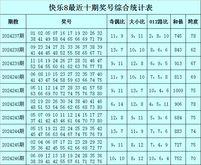 福彩快乐8第2024246期开出奖号:06 09 12 13 18 19 24 28 35 36 38 39 41 42 55 57 61 71 72 76,其中奖号奇偶比开出10:10,大小比开出8:12,和值开出752,跨度开出70,012路比开出10:6:4。