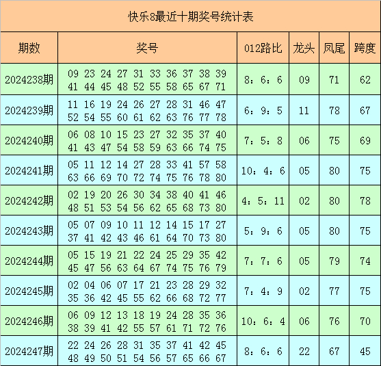 快乐8第2024247期奖号为:22 24 26 28 31 35 37 41 42 45 48 49 50 51 54 56 57 65 66 67,其中奖号012路比为8:6:6,0路号码(8个):24、42、45、48、51、54、57、66,1路号码(6个):22、28、31、37、49、67,2路号码(6个):26、35、41、50、56、65。
