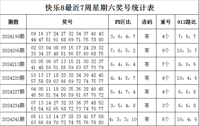 福彩快乐8第2024241期(上周六)奖号回顾:05 11 12 14 27 28 33 41 57 58 63 66 69 70 72 74 75 76 78 80,其中奖号四区比为4:3:3:10,012路比为10:4:6,包含6个重号14、27、33、72、74、76,包含连码11 12、27 28、57 58、69 70、74 75 76。