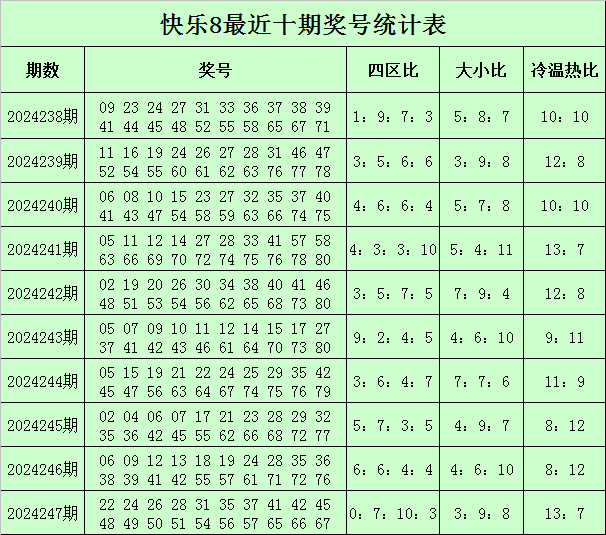 福彩快乐8第2024247期开奖回顾:22 24 26 28 31 35 37 41 42 45 48 49 50 51 54 56 57 65 66 67,其中奖号四区比为0:7:10:3,冷温热码比为3:9:8,大小比为13:7,和值为894,同尾号码为31 41 51、22 42、24 54、35 45 65、26 56 66、37 57 67、28 48。