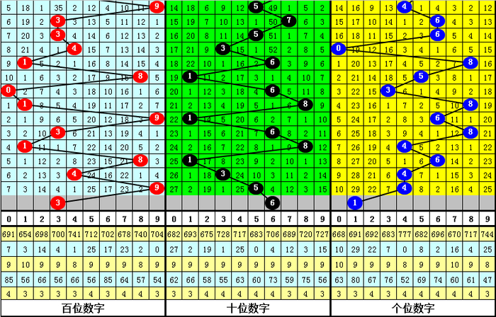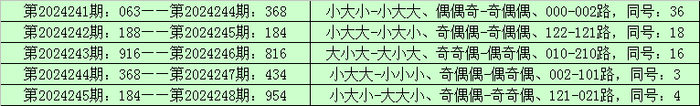 统计排列三已开出的奖号发现,在连续5期(第2024241期-第2024245)奖号为:063-188-916-368-184。
