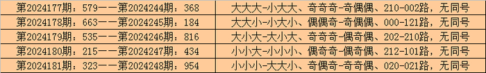 在排列三历史开奖中,第2024177期-第2024181期连续5期奖号为:579-663-535-215-323。