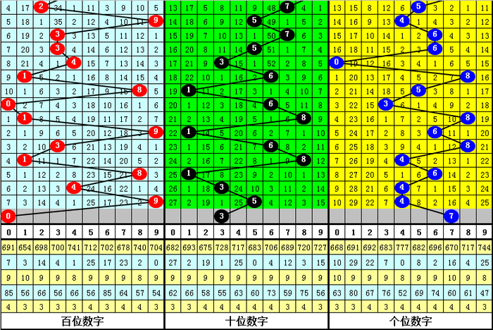 百位分析:该位上期奖号为9,出现0路、奇数、大号,在前11期奖号,该位012路比为4:5:2,2路号码较少,目前012路号码遗漏期数分别为0、1和2,近期百位注意0路号码走热。