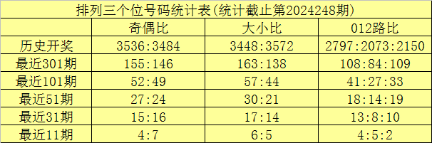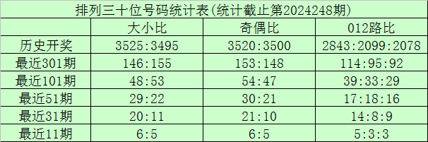上期回顾:排列三第2024248期奖号为:954。奖号形态组六,大小比2:1,奇偶比2:1,012路1:1:1。