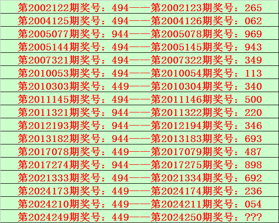 福彩3D第2024250期开奖日期:2024年9月16日,历史上第250期已开出了22次奖号,历年同期号码分别为:271、740、416、434、411、706、369、319、267、770、023、904、180、873、416、142、551、575、863、872、041、968。