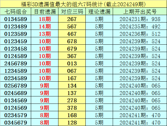 1.截止第24249期,七码组六遗漏最大的是:0134589,当前遗漏18期。