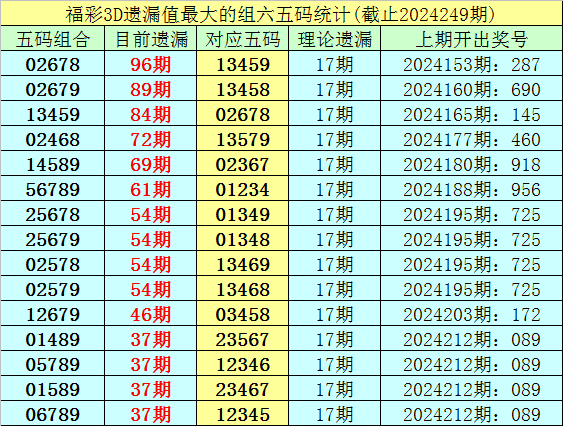 4.截止第24249期,五码组六遗漏最大的是:02678,当前遗漏96期。短期解冻的可能性较小,则24250期奖号分布在02678-13459之中的可能性最大。