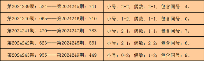 统计3D历史上已开出的奖号发现,在连续5期开奖号码中:3D在第2024239期-第2024243期分别开出奖号:524-065-470-623-955。