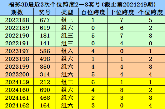 第2024159-第2024161期奖号:212、690、468,其下期奖号为:164,末位号码跨度为3;