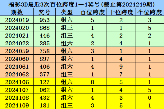 第2024106-第2024108期奖号:127、062、432,其下期奖号为:181,首位号码跨度为3;