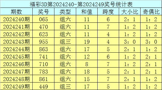 类型判断:上期奖号为449。号码4近10期出现4次,走冷,号码出现频次较低,上期各位号码走势较温,本期关注温码开出。