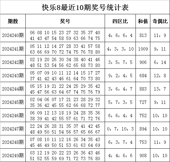 福彩快乐8第2024249期开出奖号:03 12 19 20 22 23 26 36 43 46 51 52 55 59 69 71 72 73 76 80,其中奖奇偶比10:10,四区比为4:4:6:6。