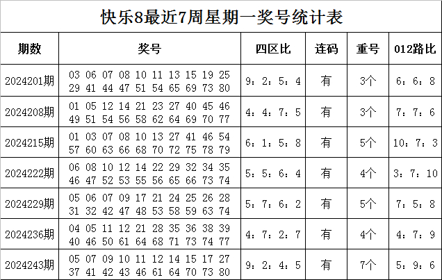 福彩快乐8第2024243期(上周一)奖号回顾:05 07 09 10 11 12 14 15 17 27 37 41 42 43 46 61 64 70 73 80,其中奖号四区比为9:2:4:5,012路比为5:9:6,包含7个重号05、11、12、46、61、64、73,包含连码09 10 11 12、14 15、41 42 43。