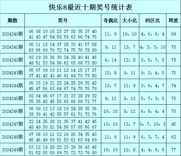 福彩快乐8第2024249期开奖回顾:03 12 19 20 22 23 26 36 43 46 51 52 55 59 69 71 72 73 76 80,其中奖号012路比为6:8:6,奖号尾数012路比为13:2:5。