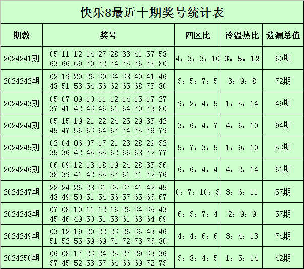 福彩快乐8第2024250期开奖回顾:06 08 17 23 24 25 27 29 33 36 37 45 52 53 57 64 66 69 72 73,其中奖号四区比为3:8:4:5,冷温热码比为1:5:14,遗漏总值为42。