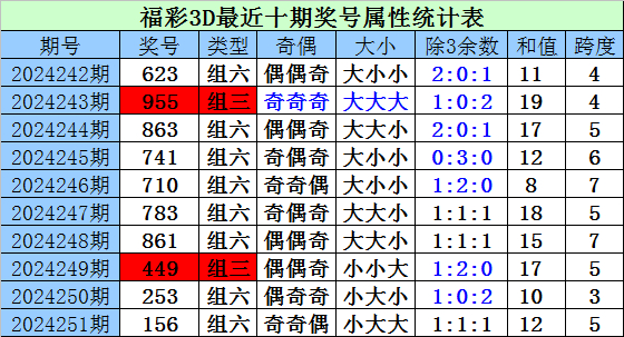 除3余数:上期除3余数比为1:1:1,各余数号码出现个数相等,本期看好各余数继续平衡,余数比参考1:1:1。