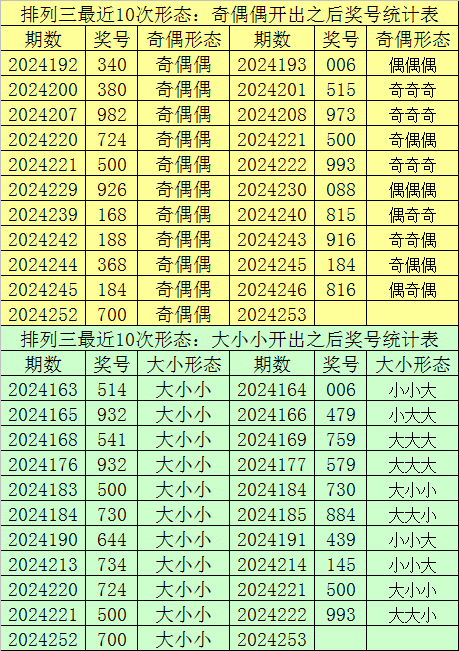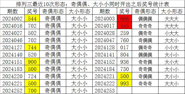 排列三最近10次同时开出奇偶形态:奇偶偶和大小形态:大小小时其奖号分别为:544-702-502-702-744-520-900-500-724-500-700,下期分别开出号码为:666-555-259-760-017-804-936-730-500-993,详细统计见下表: