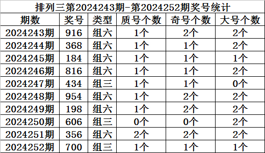 上期回顾:排列三第2024252期开奖:700,质合比为1:2,奇偶比为1:2,大小比为1:2。