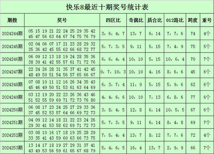 福彩快乐8第2024253期开奖回顾:13 14 17 18 19 27 29 31 37 41 43 49 53 56 59 61 65 67 68 79,其中奖号四区比为5:4:6:5,奇偶比为16:4,质合比为13:7,跨度为66,012路比为2:9:9,开出7个重号:17、18、19、29、41、43、59。