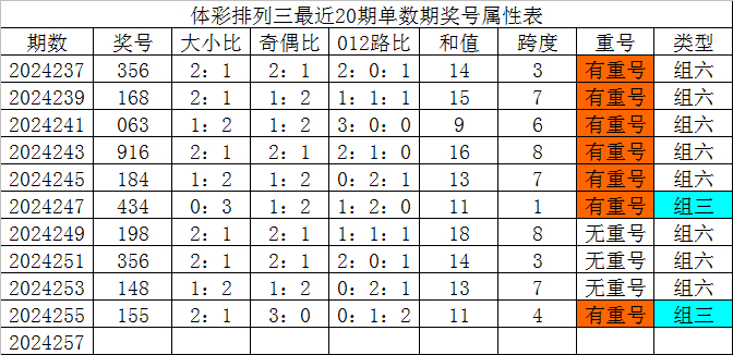 体彩排列三最近20期单数期奖号分别为:356、168、063、916、184、434、198、356、148、155,各期奖号详细属性下表: