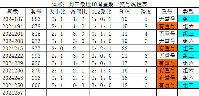 体彩排列三最近10周星期一奖号分别为:883、078、515、973、877、993、926、376、916、606,各奖号属性详见下表:
