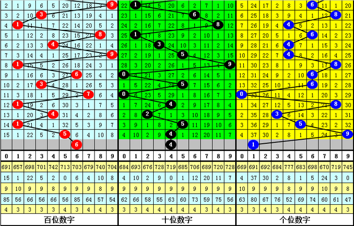 其中,号码0-9开出次数分别为:号码0开出3次、1开出3次、2开出1次、3开出3次、4开出6次、5开出5次、6开出3次、7开出1次、8开出2次、9开出3次。