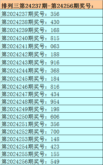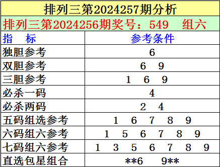 1.排列三最近十期分别开出号码:434-954-198-606-356-700-148-423-155-549,其中有5期奖号开出了上期的重复号码,本期预计第2024256期奖号:549中有重号,参考号码:9。