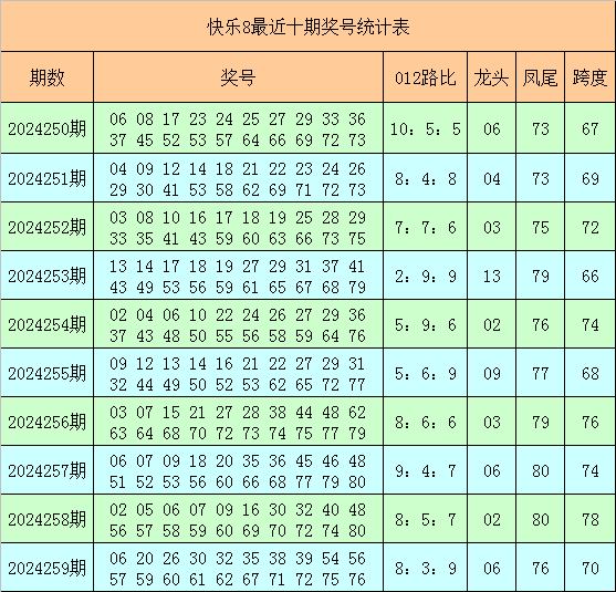 快乐8第2024259期奖号为:06 20 26 30 32 35 38 39 54 56 57 59 60 61 62 67 71 72 75 76,其中奖号012路比为8:3:9,0路号码(8个):06、30、39、54、57、60、72、75,1路号码(3个):61、67、76,2路号码(9个):20、26、32、35、38、56、59、62、71。