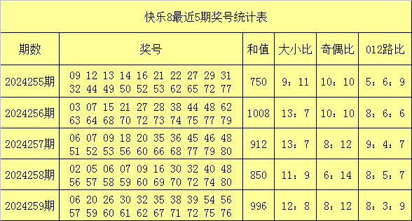 快乐8第2024259期奖号为:06 20 26 30 32 35 38 39 54 56 57 59 60 61 62 67 71 72 75 76,其中奖号012路比为8:3:9,跨度为70。