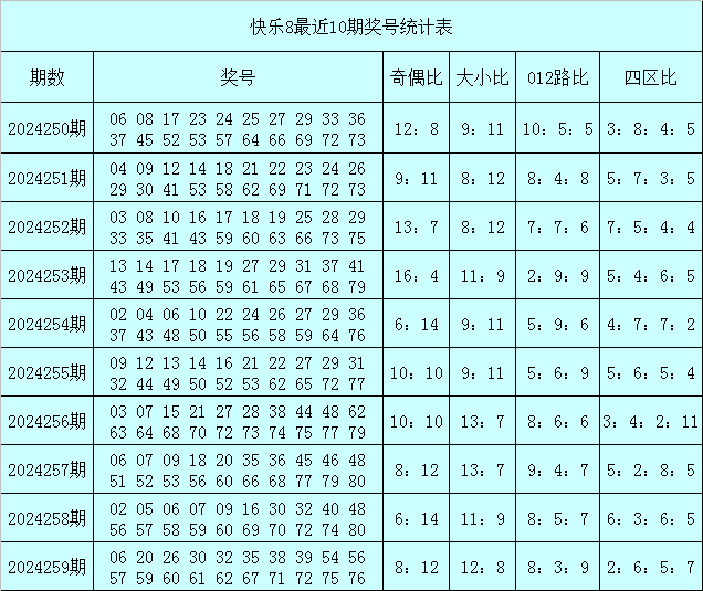 福彩快乐8第2024259期开出奖号:06 20 26 30 32 35 38 39 54 56 57 59 60 61 62 67 71 72 75 76,其中奖号奇偶比为8:12,大小比为12:8,012路比为8:3:9,四区比为2:6:5:7。