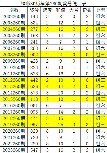 福彩3D历年第260期同期分别开出奖号:143、534、277、158、241、268、002、423、823、628、442、626、578、118、061、095、474、997、820、720、280、547,详细统计见下表: