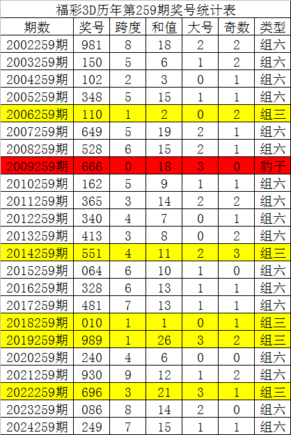 从以上统计可以看出,历年3D第260期开出了7次组三号码,开出了15次组六号码。组六号码出现概率大,本期预计开出组六号码。