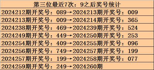 开奖回顾:第2024259期福彩3D奖号为249,和值15,跨度7,形态:偶偶奇、小小大。