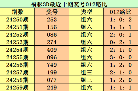 开奖回顾:第2024259期3D奖号为249。形态:组六,奇偶比1:2,大小比1:2,012路比为1:1:1。