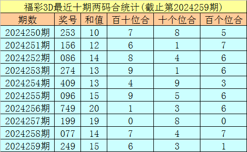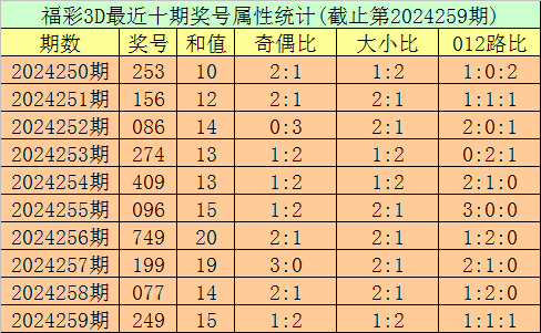 开奖回顾:第2024259期福彩3D奖号为249。奖号形态为组六,大小比为1:2,和值为15,奇偶比为1:2,012路比为1:1:1,跨度为7。