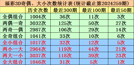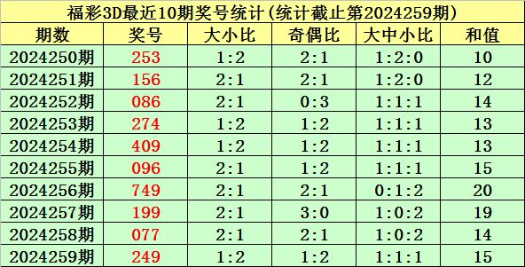 开奖回顾:福彩3D第2024259期奖号为:249。奖号类型为组六,和值为15,奇偶比为1:2,跨度为7,012路比为1:1:1,大小比为1:2。