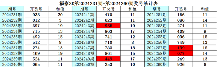 上期回顾:福彩3D第2024260期奖号为:926,其中奖号组选类型为:组六,奇偶比为1:2,大小比为2:1,012路比为2:0:1,和值为17,跨度为7。