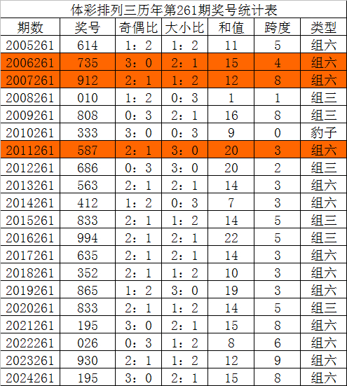 排列三第2024261期奖号为195,奇偶比为3:0,大小比为2:1,和值为15,跨度为8。