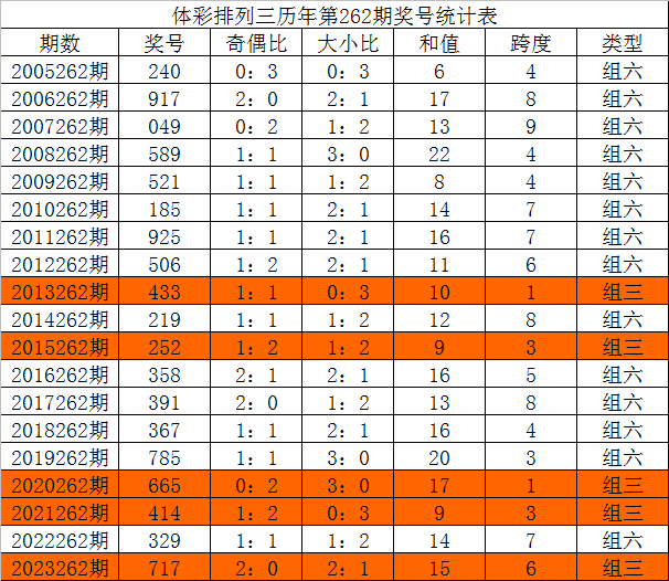 体彩排列三历年第262期开出奖号分别为:240、917、049、589、521、185、925、506、433、219、252、358、391、367、785、665、414、329、717。统计详见下表: